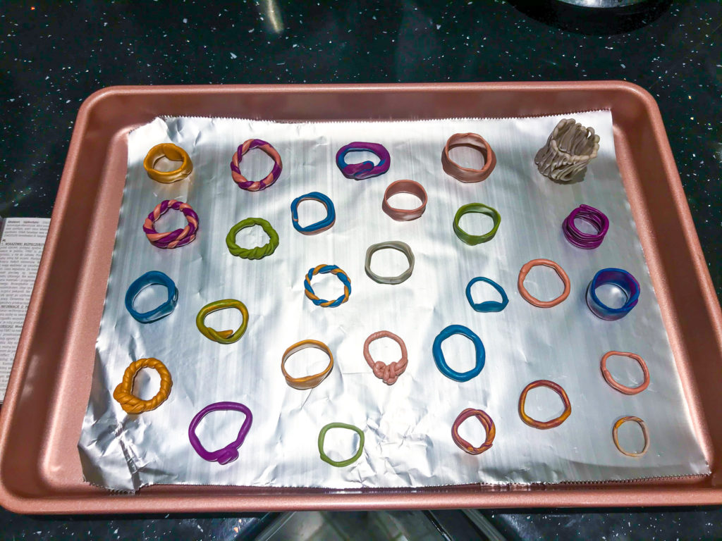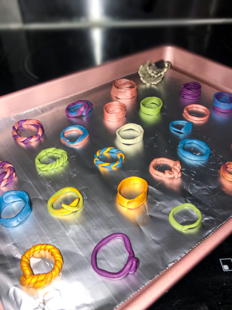 Here are my rings before I popped them into the oven to bake. I created a total of 28, all in different colours and shapes. I laid it all on foil, on top of a baking tray. This is vital to ensure you do not damage the baking tray. To be honest, this was my first time baking clay and I was quite worried that I would burn it. I kept opening the oven to glare at my rings, heavily surveilling it for any burnt edges or black dust stained around it.