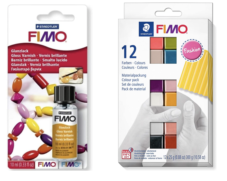 I bought the 12 pack of Fimo Clay from Staedtler (in ‘Fashion’ colours of course, although I don’t quite understand why the company believed that these certain colours were more fashionable than the colours they omitted from the set), as well as the Gloss Varnish** that you use to glaze the clay after it comes out the oven. You can purchase both from Amazon!