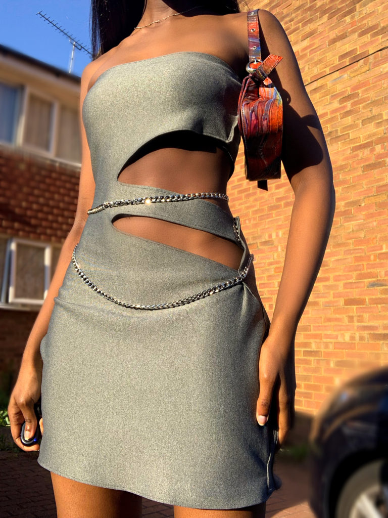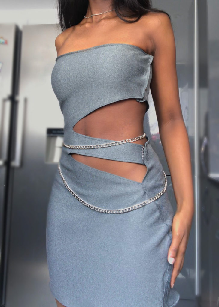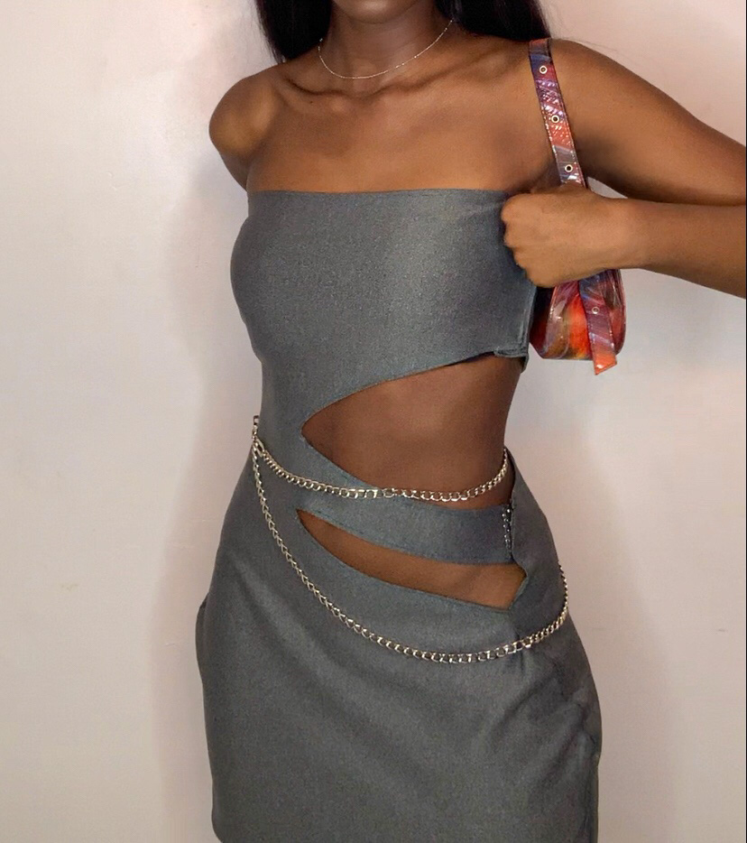 Above is a clear photo showing how I can bring the chain to curve around my waist better, whilst the bottom photos show how I moved the chains to mirror and enhance the cut outs that are on the mini dress.
