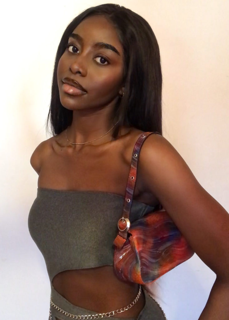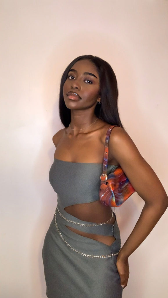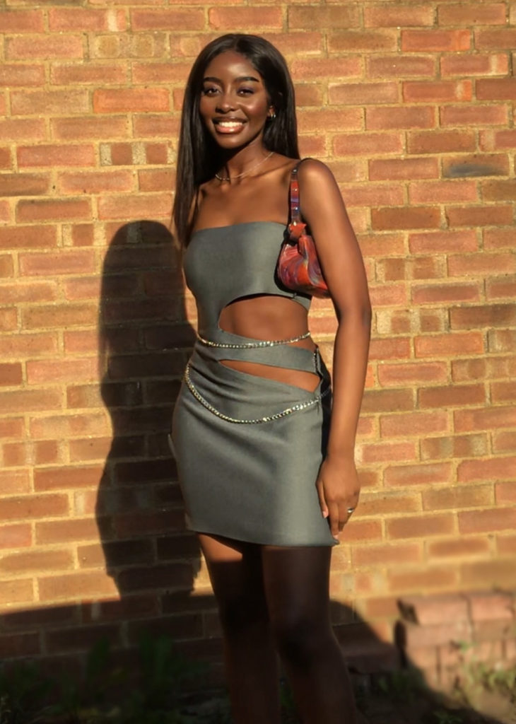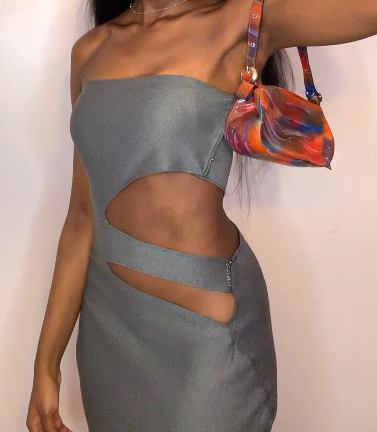 With this creation, I started off by sketching a basic mini dress and instantly felt underwhelmed and bored by the visual presented infront of me. It was giving me nothing. So, I picked up the pencil again and I started to really think about my own personal style. I then began to add in a bold cut out feature, and a double chained waist belt; two features that immediately bought the look to life, and added a little XDF flair to it.